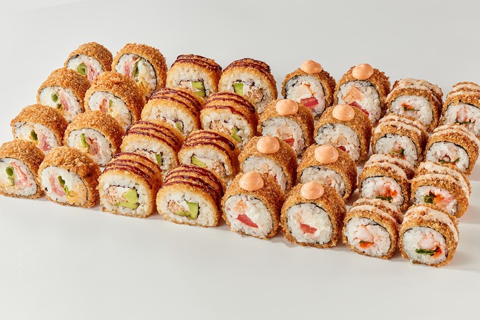 Курица на снегу, Сырный бекон, Понтовая креветка, Горячий с лососем и авокадо