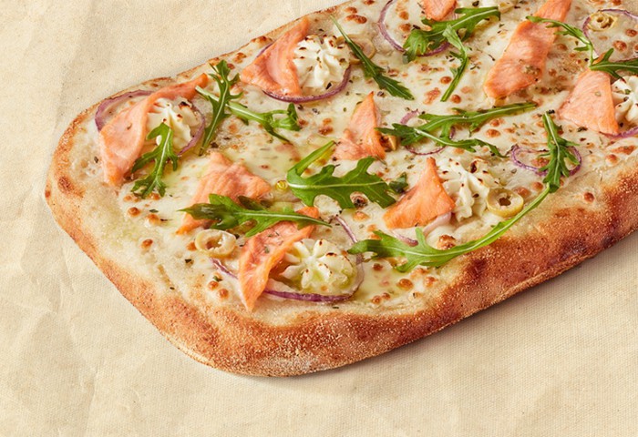 Лосось, моцарелла, соус сливочный, сливочный сыр, рукола, оливки, красный лук, украшена соусом песто