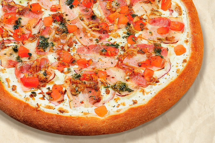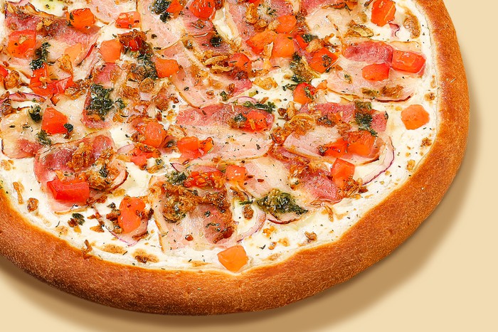 Бекон, томаты, лук красный и фри, моцарелла и сливочный соус. Украшена соусом песто