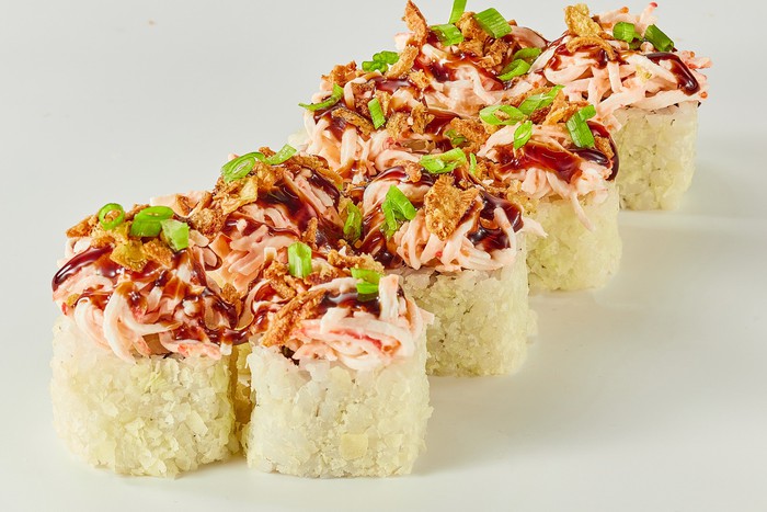 Краб, сливочный сыр, огурец, зеленый лук, лук фри, соус терияки