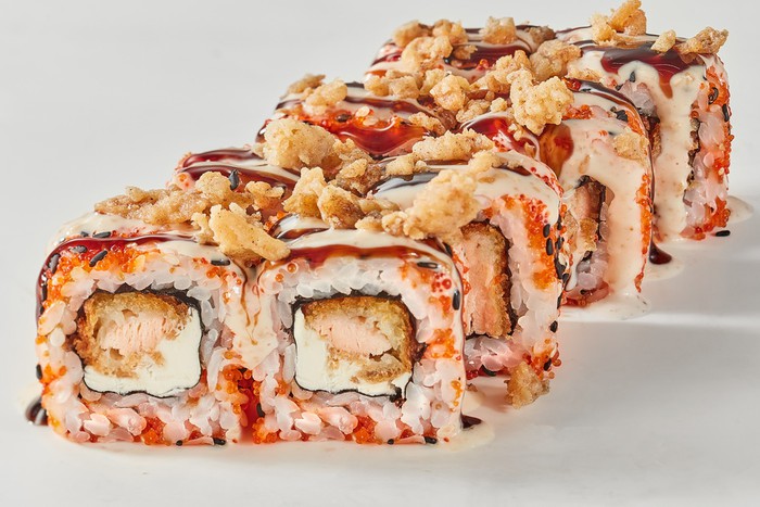 Лосось, сливочный сыр, тобико, кунжут, лук фри, ореховый соус, соус терияки