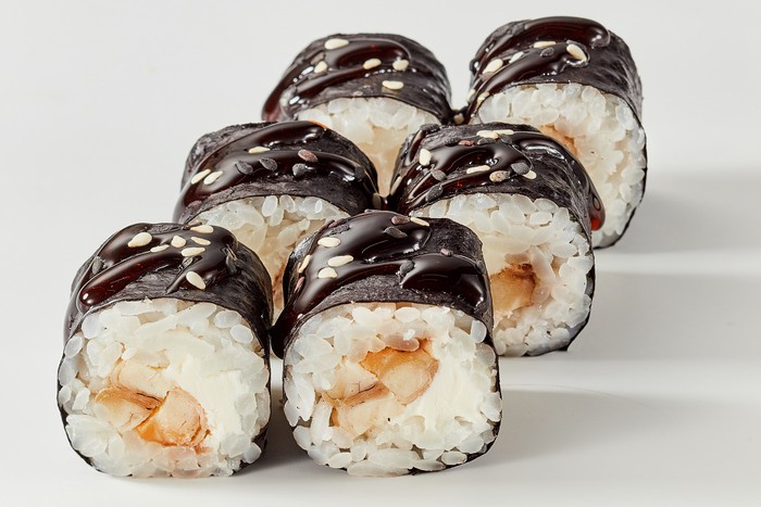 Угорь, сыр сливочный, водоросли нори, рис, соус унаги и кунжут