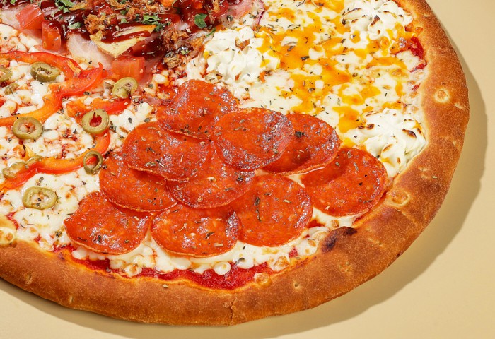 Моцарелла, чеддер, сыр сливочный, томатный соус, перец болгарский, оливки, пепперони, бекон, курица, томат, лук красный, соус барбекю, петрушка, лук фри