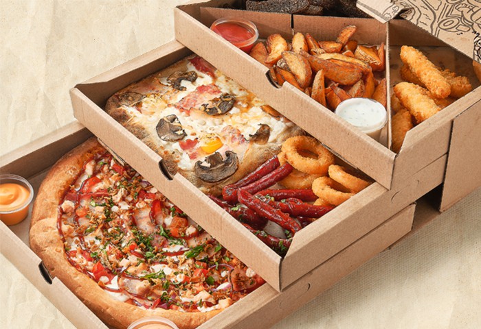 Пицца Чикен BBQ 30 см, римская пицца Сливочная Карбонара, охотничьи колбаски, сырные палочки, луковые колечки, картофельные дольки, гренки чесночные , соус сырный, соус спайси, кетчуп и сметанно-чесночный соус