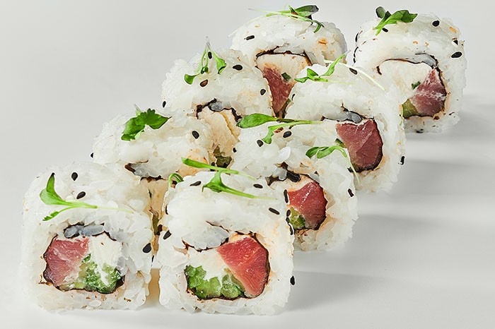 Тунец, сливочный сыр, огурец, рис, нори, кунжут, микрозелень кинзы