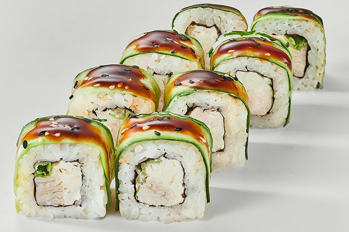 Курица, сливочный сыр, огурец, салат айсбер, рис, нори, соус Унаги, кунжут