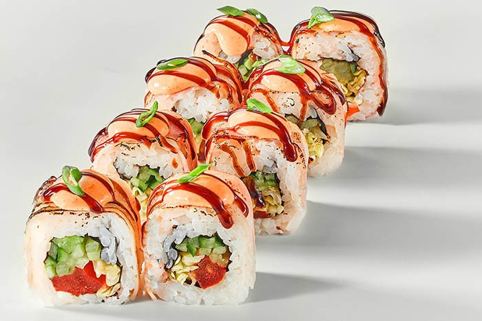 Бекон, огурец, томаты, салат айсберг, рис, нори, соус спайси, соус терияки, лук зеленый