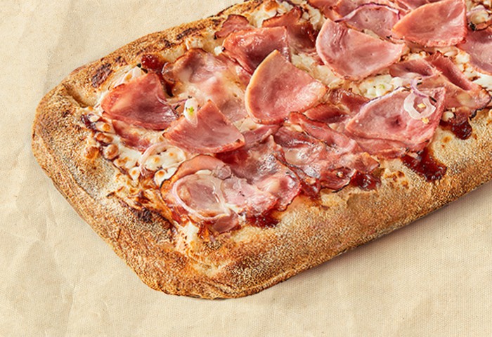 Бекон, ветчина, сыр моцарелла, красный лук, соус сливочный, соус барбекю