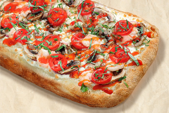 Креветки, томаты черри, шампиньоны, лук красный, петрушка, сыр моцарелла, соус сливочный и соус том ям