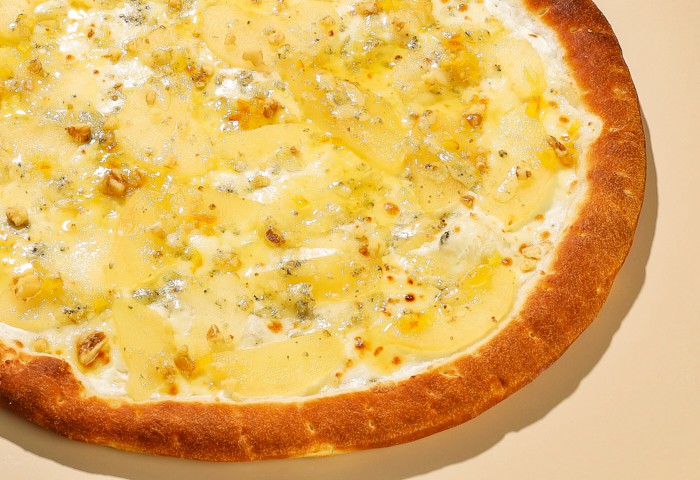 Груша консервированная, сыр дор блю, сыр моцарелла, грецкий орех, соус сливочный, апельсиновый сироп