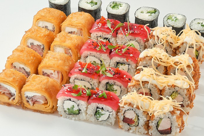 Филадельфия с тунцом Гуд, Горячий бекон, Цезарь с луком фри, Сливочный огурец