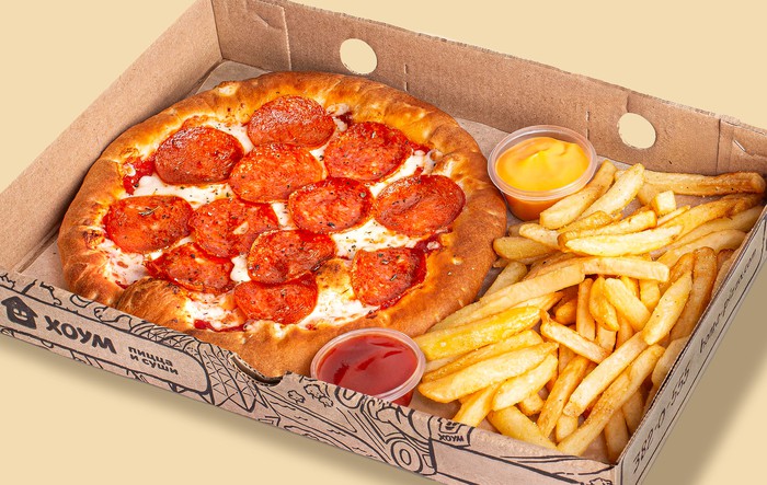 Пицца пепперони, картофель фри , соус сырный, кетчуп