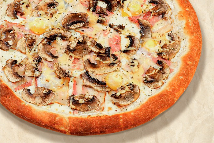 Перепелиное яйцо с жидким желтком, бекон, шампиньоны, пармезан, моцарелла и сливочный соус