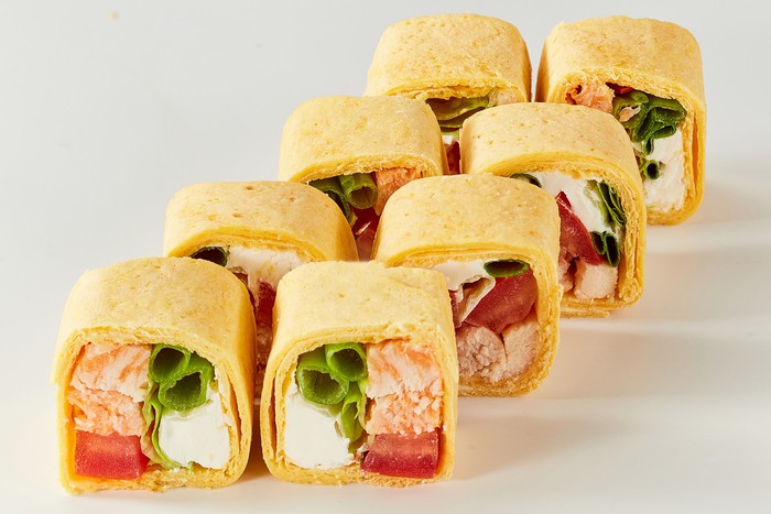 Ролл в лепешке тортилья без риса, с начинкой из сливочного сыра, куриного филе, томатов, салата и лука