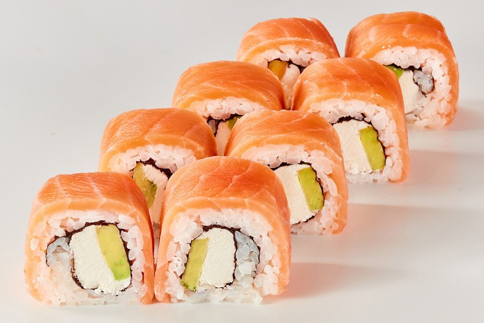 Ролл обвернутый лососем на 3/4 с начинкой из сливочного сыра и авокадо