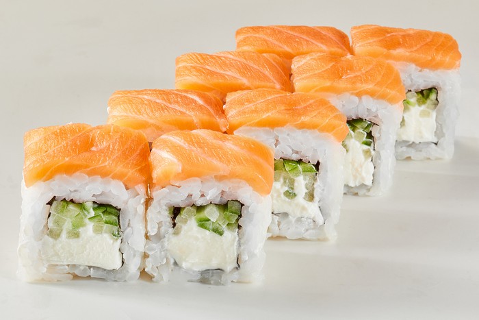 Ролл с шапочкой из лосося и начинкой из сливочного сыра и огурца