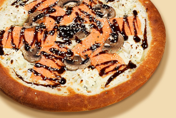Лосось, шампиньоны, моцарелла, сливочный сыр и сливочный соус. Украшена соусом терияки и кунжутом