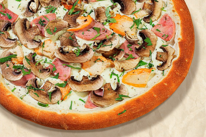 Ветчина, куриная грудка, шампиньоны, моцарелла, зелень и сливочный соус