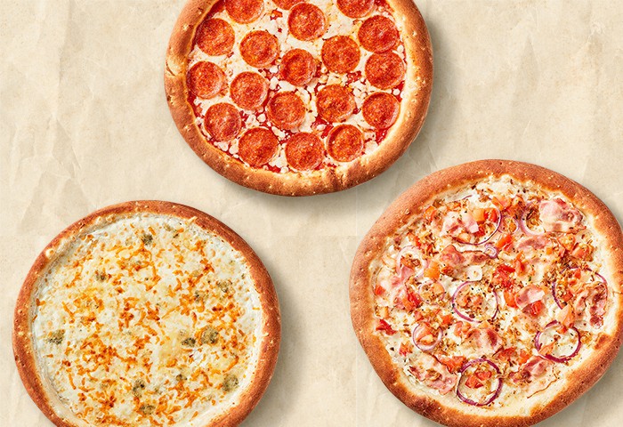 3 пиццы: Пепперони, 4 сыра, С беконом