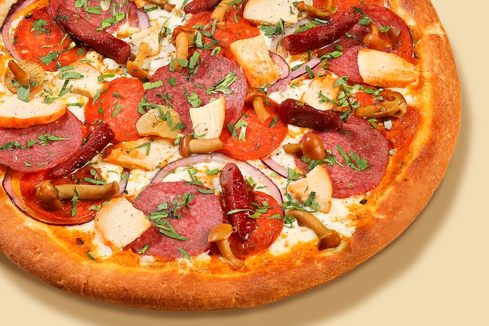 Колбаски охотничьи, сервелат, Пепперони, куриное филе, опята маринованные, моцарелла, красный лук, зелень и соус спайси
