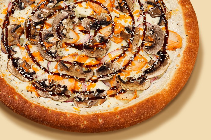 Куриное филе, шампиньоны, чеддер, красный лук и сливочный соус. Украшена кунжутом и соусом терияки