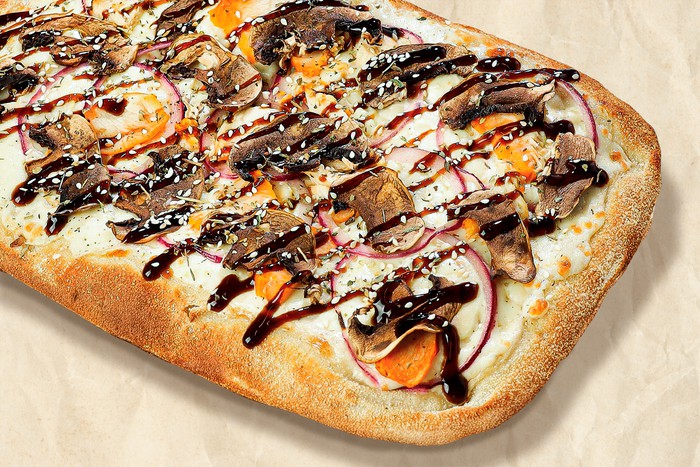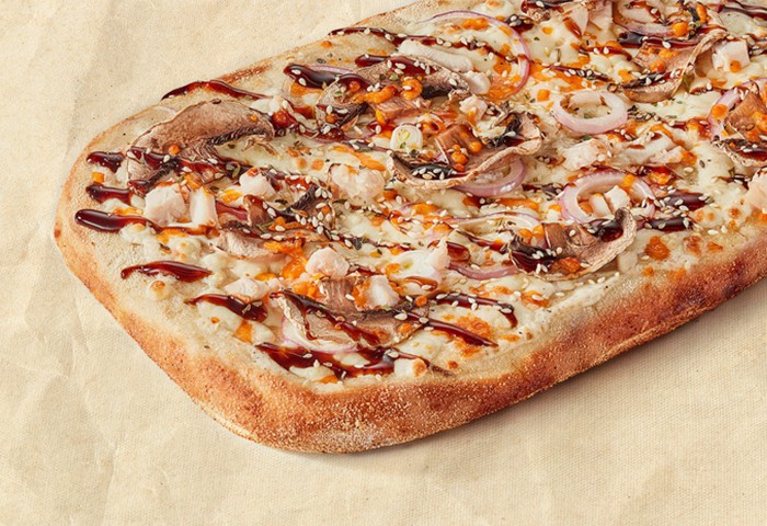 Куриное филе, шампиньоны, чеддер, моцарелла, красный лук и сливочный соус, украшена кунжутом и соусом терияки